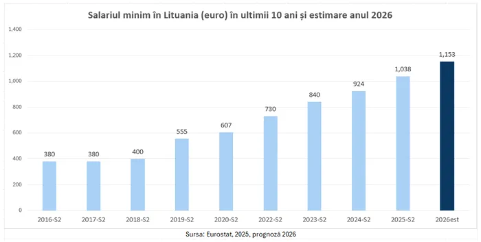 A implementat formula conform căreia salariul minim brut să reprezinte 50% din salariul mediu încă din anul 2018. Lituania a majorat accelerat salariul minim brut în euro, în ultimii 10 ani creșterea agregată fiind de 173%, de la 380 euro în anul 2016 la 1038 euro în prezent). În ultimii 3 ani creșterea a fost consistentă, plus 42%. De observat că Lituania a depășit consistent Ungaria și Polonia începând cu anul 2019. Dacă, începând de atunci, Ungaria a rămas mult în spatele Lituaniei, Polonia a întrecut din nou țara baltică începând din anul 2024. Însă din 2026, valorile se egalează din nou la nivelul celor două țări – Polonia și Lituania. Pentru anul 2026, scenariul privind salariul minim brut în euro, presupune o creștere la 1153 euro pe lună (plus 11%). Astfel, Lituania egalează din nou Polonia la acest indicator.