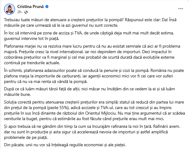 „În loc să intervină pe zona de acciză şi TVA, de unde câştigă deja mult mai mult decât estima, guvernul intervine tot în piaţă. Plafonarea marjei nu va rezolva mare lucru pentru că nu au existat semnale că aici ar fi problema majoră. Preţurile cresc la nivel internaţional, iar noi depindem de importuri. Deci impactul în coborârea preţurilor va fi marginal şi cel mai probabil de scurtă durată dacă evoluţiile externe continuă pe trendurile actuale. În schimb, plafonarea adaosurilor poate să conducă la penurie şi cozi la pompă”, a scris Cristina Prună.