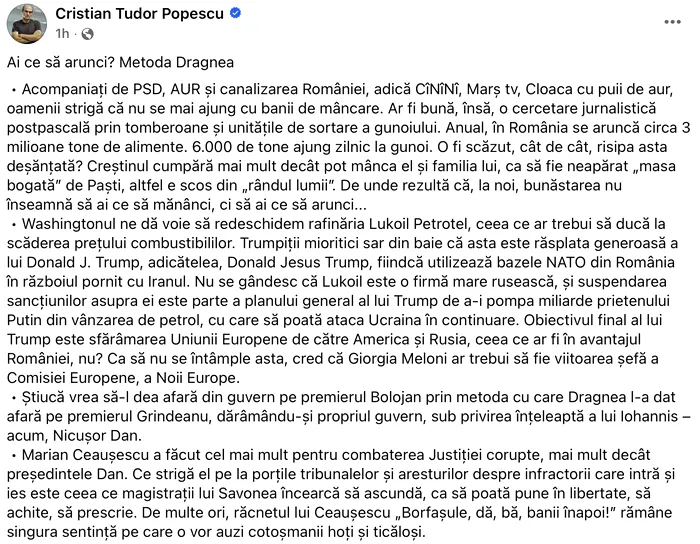 Gazetarul Cristian Tudor Popescu a venit cu o nouă postare pe pagina sa de Facebook, în care vorbește despre risipa alimentară din România, dar și despre jocuri politice interne și externe. Mesajului transmis de CTP îl vizează și pe Donald Trump, despre care spune că are un plan care ar putea afecta direct Uniunea Europeană.