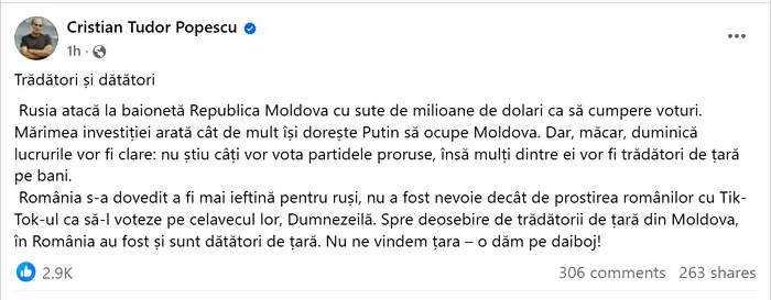 „Trădători și dătători: Rusia atacă la baionetă Republica Moldova cu sute de milioane de dolari ca să cumpere voturi. Mărimea investiției arată cât de mult își dorește Putin să ocupe Moldova. Dar, măcar, duminică lucrurile vor fi clare: nu știu câți vor vota partidele proruse, însă mulți dintre ei vor fi trădători de țară pe bani.România s-a dovedit a fi mai ieftină pentru ruși, nu a fost nevoie decât de prostirea românilor cu Tik-Tok-ul ca să-l voteze pe celavecul lor, Dumnezeilă. Spre deosebire de trădătorii de țară din Moldova, în România au fost și sunt dătători de țară. Nu ne vindem țara – o dăm pe daiboj!”