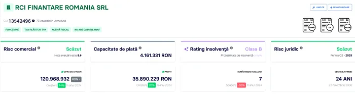 RCI Finanțare România, compania controlată  de Jose Aguirre și Simone Boni, are o cifră de afaceri de peste 120 de milioane de lei și un profit de aproape 36 de milioane, deși are doar șapte angajați, potrivit datelor de pe platforma Termene.ro.
