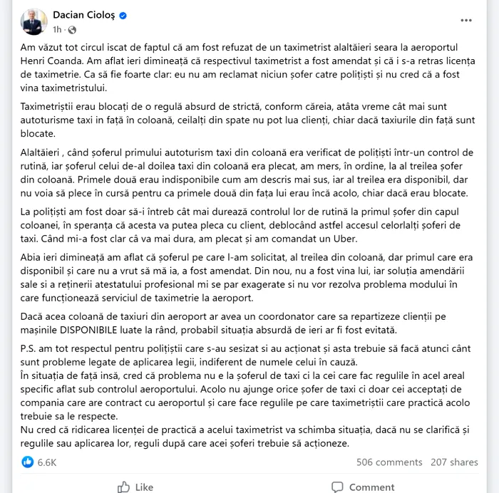 „Am văzut tot circul iscat de faptul că am fost refuzat de un taximetrist alaltăieri seara la aeroportul Henri Coanda. Am aflat ieri dimineață că respectivul taximetrist a fost amendat și că i s-a retras licența de taximetrie. Ca să fie foarte clar: eu nu am reclamat niciun șofer catre polițiști și nu cred că a fost vina taximetristului.Taximetriștii erau blocați de o regulă absurd de strictă, conform căreia, atâta vreme cât mai sunt autoturisme taxi in față în coloană, ceilalți din spate nu pot lua clienți, chiar dacă taxiurile din față sunt blocate”.