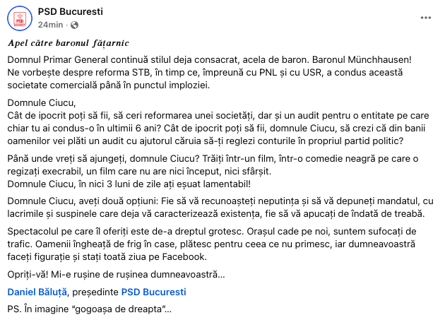 Conflictul dintre Daniel Băluță și Ciprian Ciucu continuă. Primarul Sectorului 4, Daniel Băluță, îl acuză public pe primarul general, Ciprian Ciucu, de ipocrizie, incompetență și lipsă de acțiune. Declarațiile apar într-un mesaj dur, publicat pe Facebook, în care liderul social-democrat critică atât planurile de reformă ale STB, cât și modul general de administrare a orașului. „În nici trei luni de zile ați eșuat lamentabil”, declară Băluță.