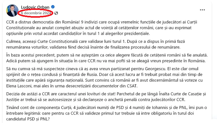 Fostul premier al României și lider PNL, Ludovic Orban, proaspăt numit consilier pentru politică internă al președintelui Nicușor Dan, scria într-o postare pe rețelele sociale din 6 decembrie 2024, ZIUA ANULĂRII ALEGERILOR, că decizia CCR are „caracterul unei lovituri de stat”.