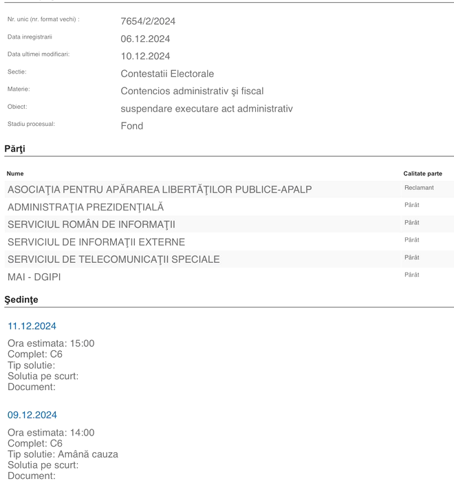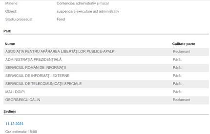 Cererea vizează suspendarea unor rapoarte și note de informare întocmite de aceste instituții de securitate națională, documente care au fost desecretizate și depuse în fața instanței după o ședință a Consiliului Suprem de Apărare a Țării (CSAT) din 28 noiembrie 2024.
