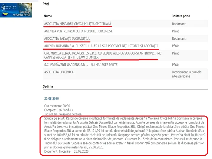 „Respinge cererea modificată formulată de reclamanta Asociația Mișcarea Civică Miliția Spirituală și cererea formulată de reclamanta Asociația Salvați Bucureștiul ca neîntemeiate. Admite cererea de intervenție accesorie formulată de Asociația Lexcivica în sprijinul pârâtei One Mircea Eliade Properties SRL. Obligă reclamantele la plata către pârâta One Mircea Eliade Properties SRL a sumei de 55.121,99 lei cu titlu de cheltuieli de judecată și la plata către pârâta Auchan România SA a sumei de 100.658,63 lei cu titlu de cheltuieli de judecată”, se arată în dispozitivul sentinței Tribunalului București.