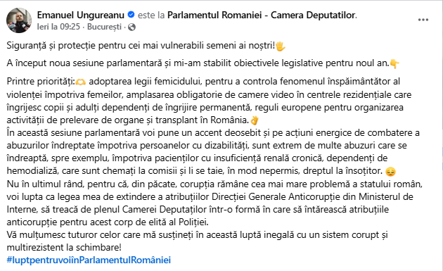 „Siguranță și protecție pentru cei mai vulnerabili semeni ai noștri! (…) Nu în ultimul rând, pentru că, din păcate, corupția rămâne cea mai mare problemă a statului român, voi lupta ca legea mea de extindere a atribuțiilor Direcției Generale Anticorupție din Ministerul de Interne, să treacă de plenul Camerei Deputaților într-o formă în care să întărească atribuțiile anticorupție pentru acest corp de elită al Poliției. Vă mulțumesc tuturor celor care mă susțineți în această luptă inegală cu un sistem corupt și multirezistent la schimbare!”, a scris Emanuel Ungureanu.