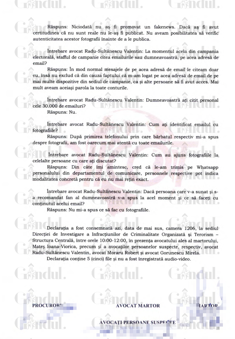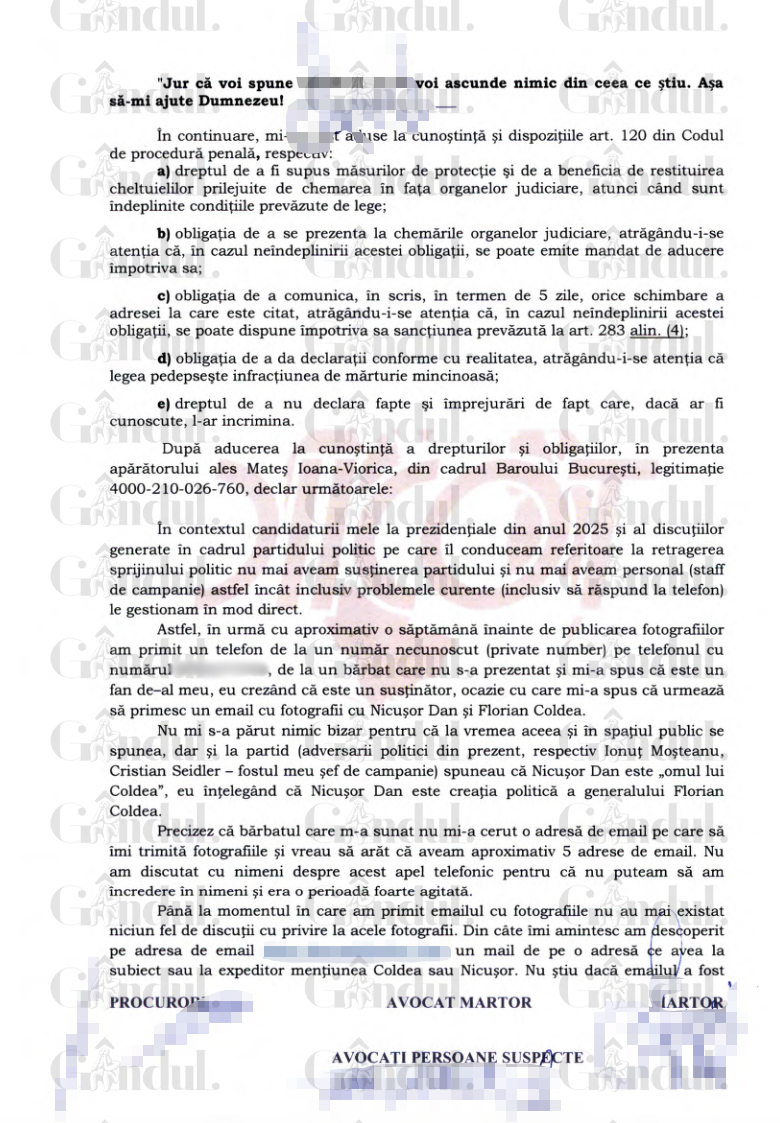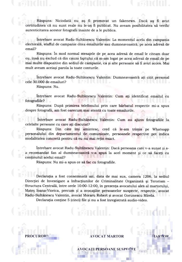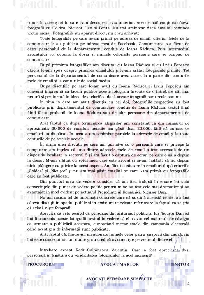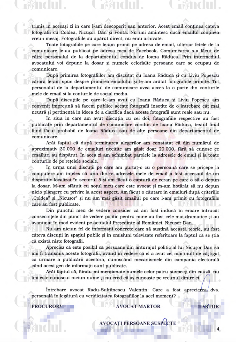 „Precizez că bărbatul care m-a sunat nu mi-a cerut o adresă de email pe care să îmi trimită fotografiile şi vreau să arăt că aveam aproximativ 5 adrese de email. Nu am discutat cu nimeni despre acest apel telefonic, pentru că nu puteam să am încredere în nimeni şi era o perioadă foarte agitată (…) Nu ştiu dacă emailul a fost trimis în aceeaşi zi în care l-am descoperit sau anterior. Acest email conţinea câteva fotografii cu Coldea, Nicuşor Dan şi Ponta. Nu îmi amintesc dacă emailul conţinea vreun mesaj. Fotografiile au apărut direct, nu erau arhivate.