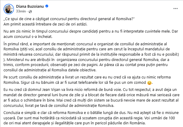 Ministra Mediului Diana Buzoianu a transmis un mesaj virulent pe Facebook în care ripostează împotriva alegerii noului director al Romsilva, Jean Vișan. Buzoianu acuză consiliul de administrație al companiei că a numit un șef „un om comod”, în fruntea Romsilva care nu va face schimbările necesare.