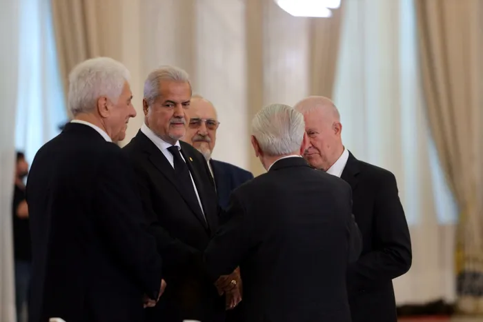 Foștii premieri, Nicolae Văcăroiu, Adrian Năstase, Viorica Dăncilă (în primul rând pe scaune), Marcel Ciolacu și Theordor Stolojan se află în Biserica Cotroceni (în al doilea rând). Printre ei, actualul premier, Ilie Bolojan.