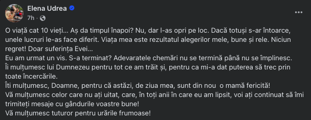 „O viață cat 10 vieți… Aș da timpul înapoi? Nu, dar l-as opri pe loc. Dacă totuși s-ar întoarce, unele lucruri le-as face diferit. Viața mea este rezultatul alegerilor mele, bune și rele. Niciun regret! Doar suferința Evei…Eu am urmat un vis. S-a terminat? Adevaratele chemări nu se termină până nu se împlinesc.Îi mulțumesc lui Dumnezeu pentru tot ce am trăit și, pentru ca mi-a dat puterea să trec prin toate încercările.Îti mulțumesc, Doamne, pentru că astăzi, de ziua mea, sunt din nou o mamă fericită!Vă mulțumesc celor care nu ați uitat, care, în toți anii în care eu am lipsit, voi ați continuat să îmi trimiteți mesaje cu gândurile voastre bune!Vă mulțumesc tuturor pentru urările frumoase!”, scrie Elena Udrea pe Facebook.