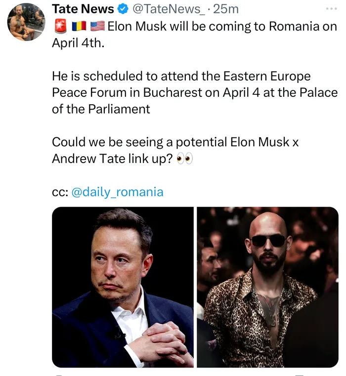 „Elon Musk va veni în România pe 4 aprilie. Este programat să participe la Forumul pentru Pace din Europa de Est din București, pe 4 aprilie, la Palatul Parlamentului. Am putea asista la o potențială legătură Elon Musk x Andrew Tate?”, se arată în postarea contului „Tate News”.