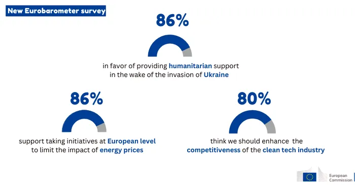 De asemenea, cercetarea confirmă un consens larg în rândul cetățenilor UE în favoarea stimulării industriei tehnologiei curate pentru mai multă competitivitate, precum și acțiunile UE întreprinse ca răspuns la invazia Rusiei în Ucraina, se arată într-un comunicat al Comisiei Europene.