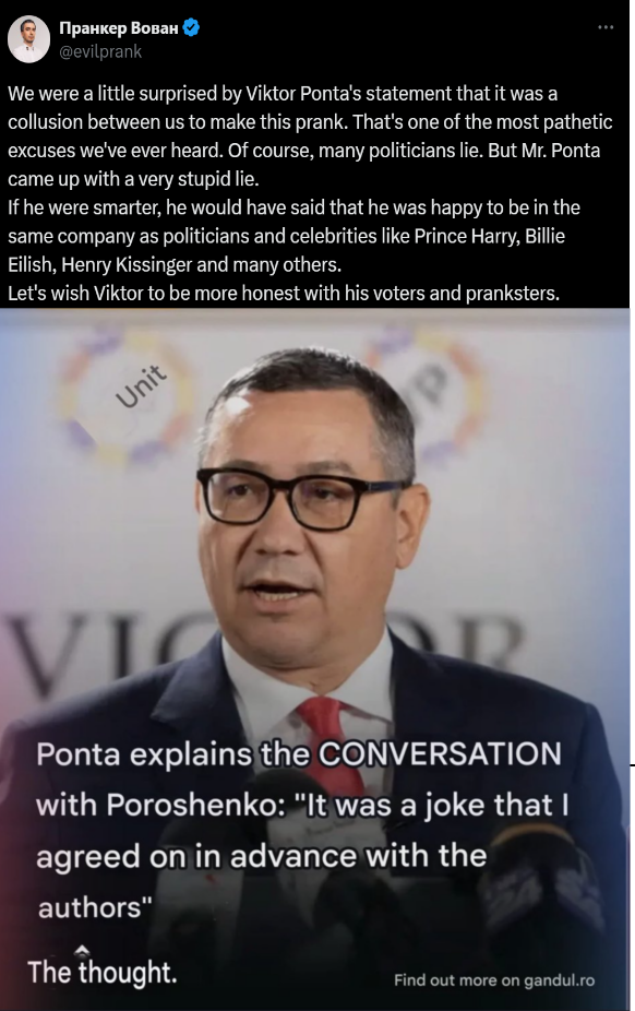 „Am fost puțin surprinși de afirmația lui Victor Ponta că a fost o complicitate între noi să facem această farsă.Aceasta este una dintre cele mai patetice scuze pe care le-am auzit vreodată.Desigur, mulți politicieni mint.Dar domnul Ponta a venit cu o minciună foarte stupidă. Dacă ar fi fost mai deștept, ar fi spus că e fericit să fie în aceeași companie cu politicieni și vedete precum Prințul Harry, Billie Eilish, Henry Kissinger și mulți alții. Să-i urăm lui Victor să fie mai sincer cu alegătorii și farsorii săi”, au transmis aceștia.