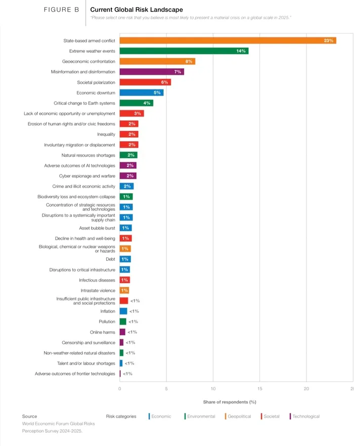 Potrivit raportului din 2025 al Forumului Economic Mondial, fenomenele meteo extreme, schimbările climatice și poluarea reprezintă o amenințare directă la stabilitatea globală.