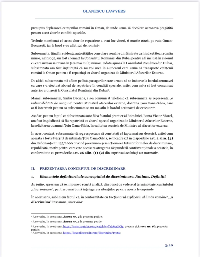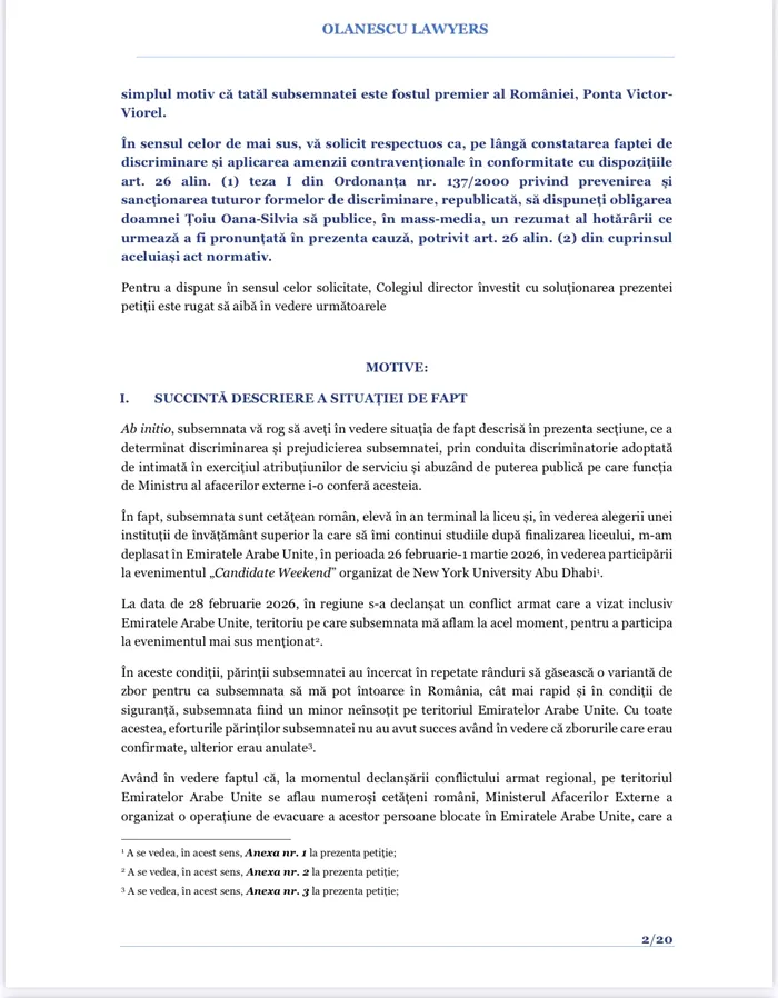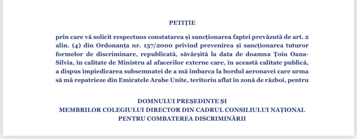 alin. (4) din Ordonanța nr. 137/2000 privind prevenirea și sancționarea tuturor formelor de discriminare, […] săvârșită la data de doamna Țoiu OanaSilvia, în calitate de Ministru al afacerilor externe care, în această calitate publică, a dispus împiedicarea subsemnatei de a mă îmbarca la bordul aeronavei care urma să mă repatrieze din Emiratele Arabe Unite, teritoriu aflat în zonă de război, pentru simplul motiv că tatăl subsemnatei este fostul premier al României, Ponta VictorViorel.