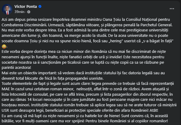 Fostul premier Victor Ponta a anunțat că fiica sa, Irina, a depus o petiție împotriva ministrului de Exterene, Oana Țoiu, pentru discriminare, în urma incidentului repatrierii care a avut loc la începutul lunii martie.