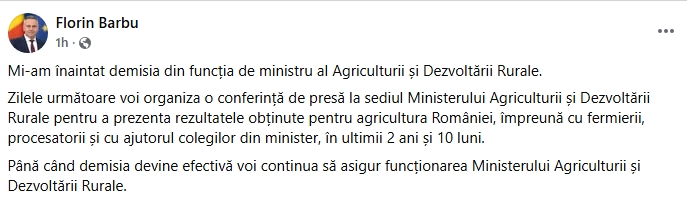 Florin Barbu a postat un mesaj pe pagina sa de Facebook, imediat după ce și-a dat demisia din funcția de Ministru al Agriculturii și Dezvoltării Rurale. Acesta a transmis că, până la momentul în care demisia sa va deveni efectivă, va continua să asigure funcționarea Ministerului.