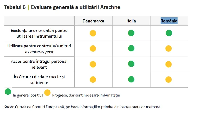 Până în mai 2025, România încărcase în Arachne aproape 8 000 de proiecte din cadrul RRF, cu mult mai puține decât alte state membre. Spre deosebire de Italia, România nu are o imagine cuprinzătoare a încărcării tuturor proiectelor RRF, ceea ce reduce eficacitatea detectării fraudelor bazate pe date.