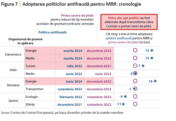 Toate organismele de punere în aplicare selectate din România instituiseră politici antifraudă. Cu toate acestea, astfel cum s-a observat în mai multe state membre, unele politici au fost adoptate numai după ce prima cerere de plată a fost transmisă Comisiei (figura 7). Acest calendar a redus asigurarea că garanțiile antifraudă adecvate erau pe deplin instituite la începutul punerii în aplicare a MRR.