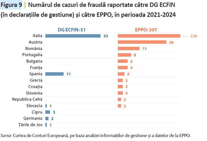 România dispune de proceduri pentru raportarea cazurilor de suspiciune de fraudă către OLAF prin intermediul AFCOS. La nivelul UE, declarațiile de gestiune arată că șase state membre au raportat DG ECFIN 51 de cazuri de suspiciune de fraudă de la începutul RRF, în 2021, până la sfârșitul anului 2024 (figura 9).