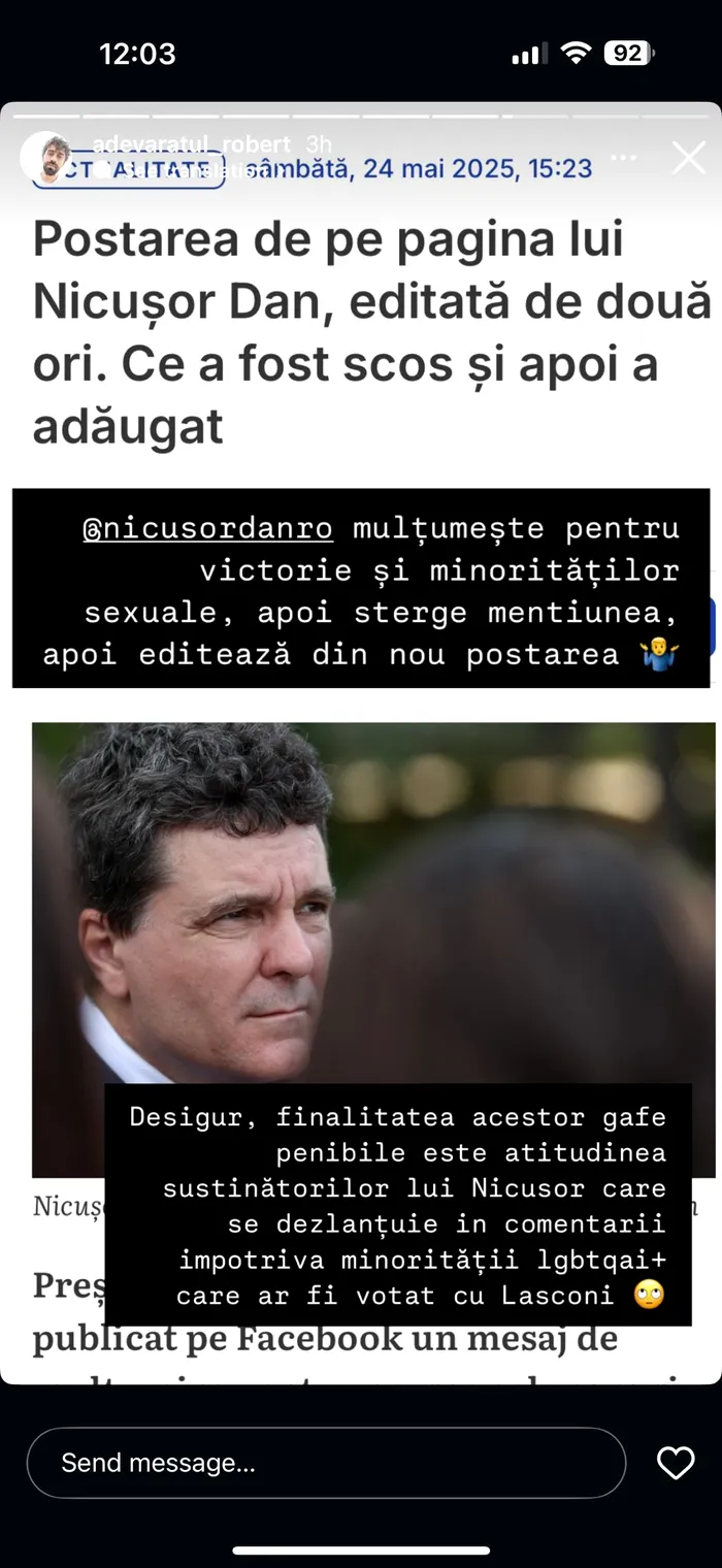 „Nicușor Dan mulțumește pentru victorie și minorităților sexuale, apoi șterge mențiunea, apoi editează din nou postarea. Desigur, finalitatea acestei gafe penibile este atitudinea susținătorilor lui Nicușor care se dezlănțuie în comentarii împotriva minorității LGBTQIA+ care ar fi votat cu Lasconi”, spune acesta în postare.