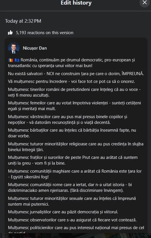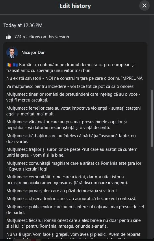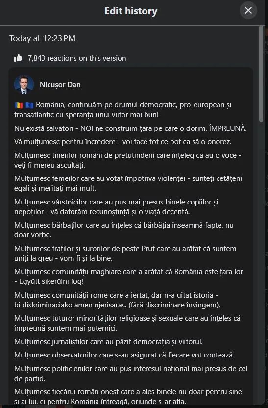 Însă, postarea lui Nicușor Dan a fost editată de mai multe ori și au fost șterse mulțumirile pentru minoritățile sexuale și religioase, apoi adăugate din nou.