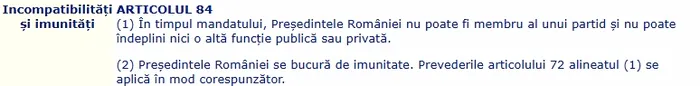 • Art 84 alin 1 din Constituție: „În timpul mandatului, Preşedintele României nu poate fi membru al unui partid şi nu poate îndeplini nici o altă funcţie publică sau privată.”
