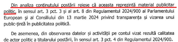 În decizia BEC se arată că materialul publicitar politic reprezintă un video realizat într-un cadru oficial, specific Administrației Prezidențiale, în care apare Președintele Romîniei, iar mesajul prezentat are un caracter electoral destinat să influențeze opțiunea de vot în favoarea candidatului/partidului susținut.