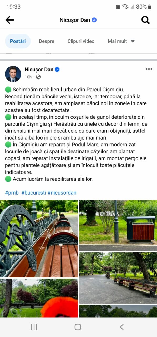 „Astăzi am început reabilitarea aleilor din Parcul Cișmigiu. Lucrăm pe porţiuni – pe măsură ce terminăm o bucată, ne mutăm la următoarea şi tot aşa mai departe. Sunt multe lucruri pe care le-am făcut în Cişmigiu – am reparat Podul Mare, cuvele celor două lacuri, locurile de joacă, ţarcurile pentru câini”, a scris Nicuşor Dan, pe Facebook, la începutul lunii aprilie.