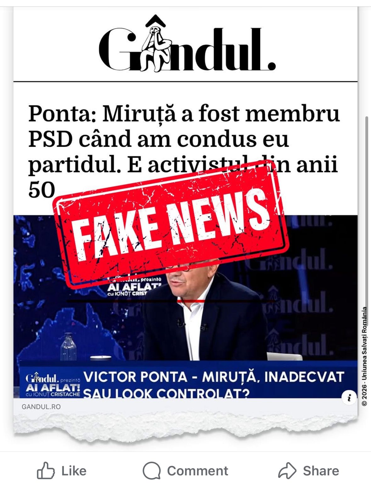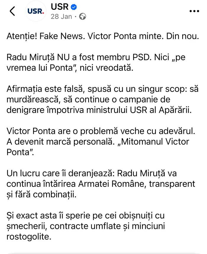 Imediat după dezvăluirea lui Ponta s-a activat scutul de protecție USR. Colegii de partid ai lui Miruță au sărit cu acuze de Fake News și au pornit o campanie publică prin care susțineau: „ Atenție! Fake News. Victor Ponta minte. Din nou. Radu Miruță nu a fost membru PSD. Nici «pe vremea lui Ponta», nici vreodată!