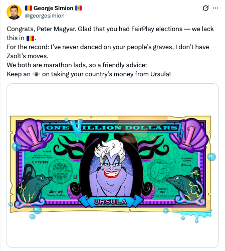 „Felicitări, Peter Magyar. Mă bucur că ați avut alegeri fair-play — noi nu avem asta în România”, a scris acesta.