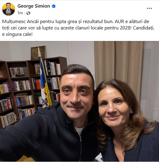 „Mulțumesc Ancăi pentru lupta grea și rezultatul bun. AUR e alături de toți cei care vor să lupte cu aceste clanuri locale pentru 2028! Candidați, e singura cale!”