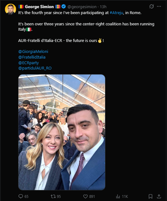 George Simion a postat pe contul său fotografia cu Giorgia Meloni, în dreptul căreia a scris: