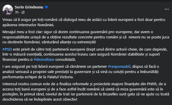 Mesajul meu a fost clar: sigur că dorim continuarea guvernării pro-europene, dar avem o responsabilitate uriașă de a obține rezultate concrete pentru români și că nimeni nu se poate juca cu destinele României, vânturând alianțe cu extremiștii!”, a declarat Sorin Grindeanu, într-o postare pe Facebook.