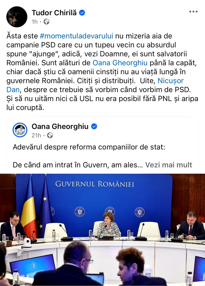 Ăsta este #momentuladevarului nu mizeria aia de campanie PSD care cu un tupeu vecin cu absurdul spune “ajunge”, adică, vezi Doamne, ei sunt salvatorii României. Sunt alături de Oana Gheorghiu până la capăt, chiar dacă știu că oamenii cinstiți nu au viață lungă în guvernele României. Citiți și distribuiți. Uite, Nicușor Dan, despre ce trebuie să vorbim când vorbim de PSD. Și să nu uităm nici că USL nu era posibil fără PNL și aripa lui coruptă”.