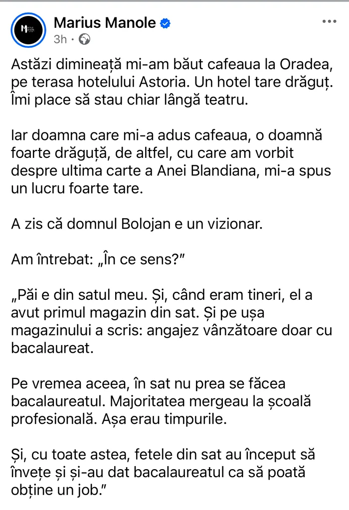 În paralel, actorul Marius Manole a publicat pe Facebook un mesaj amplu, în care îl laudă pe Ilie Bolojan, pornind de la o întâmplare personală. Actorul a subliniat că premierul este un lider „vizionar”, care a știut încă de tânăr să ridice standardele și să-i împingă pe oameni să evolueze.
