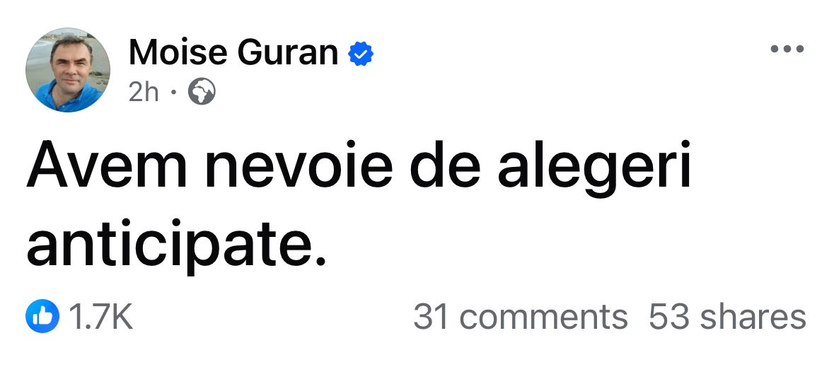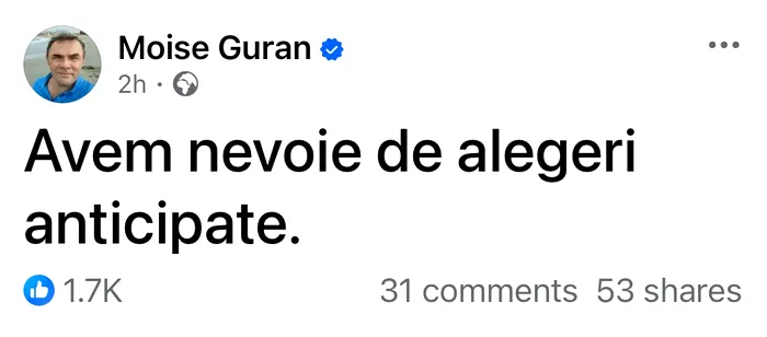 De asemenea, Moise Guran a intervenit în dezbatere cu o poziție radicală, cerând resetarea scenei politice: „Avem nevoie de alegeri anticipate”,  a scris el pe pagina sa de Facebook.