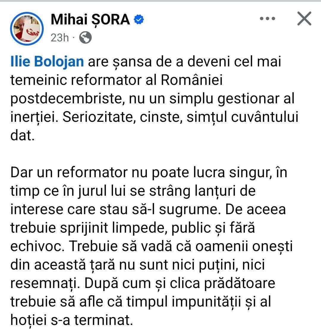 Și pe pagina de Facebook a filosofului Mihai Șora, decedat în urmă cu trei ani, a fost postat un mesaj PRO Bolojan. Printre altele, „Șora” a subliniat că îl consideră pe premier un posibil mare reformator al României postdecembriste. În postare se menționează că Bolojan are calități precum seriozitatea și integritatea, dar că nu poate reuși singur, dacă este blocat de rețele de interese.