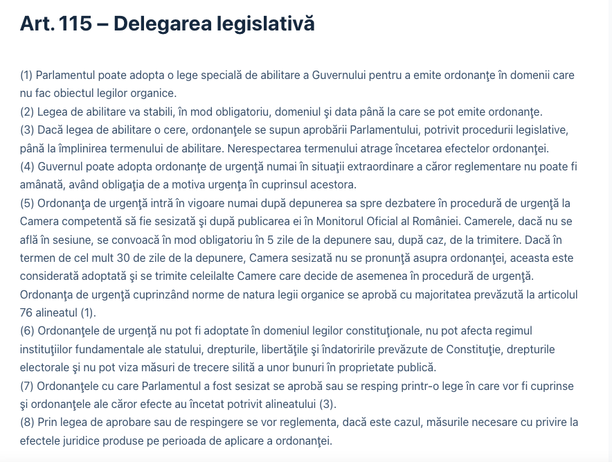 Conform Articolului 115 din Constituția României, o OUG poate fi adoptată doar dacă sunt îndeplinite cumulativ trei condiții: