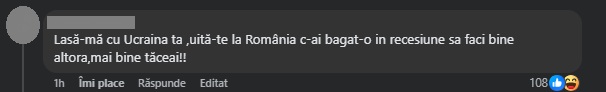 „Lasă-mă cu Ucraina ta, uită-te la România c-ai băgat-o în recesiune să faci bine altora, mai bine tăceai!!”, este comentariul unei alte comentatoare.