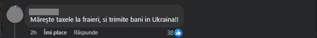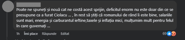 „Poate ne spuneți și nouă cât ne costă acest sprijin, deficitul enorm nu este doar din ce se presupune că a furat Ciolacu … , în rest să știți că românului de rând îi este bine, salariile sunt mari, energia și carburantul ieftine,taxele și inflația mici, mulțumim mult pentru felul în care guvernați …”, a scris unul dintre oamenii revoltați.