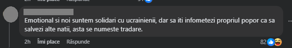 „Emoțional, și noi suntem solidari cu ucrainienii, dar să îti infometezi propriul popor ca să salvezi alte nații, asta se numește trădare”, îi transmite un alt român.