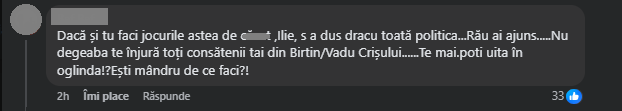 „Dacă și tu faci jocurile astea de….,llie, s-a dus dracu toată politica….Rău ai ajuns…..Nu degeaba te înjură toți consătenii tai din Birtin/Vadu Crişului…. Te mai.poti uita în oglindă!?Eşti mândru de ce faci?!”, mai spune unul dintre comentatorii nemulțumiți.