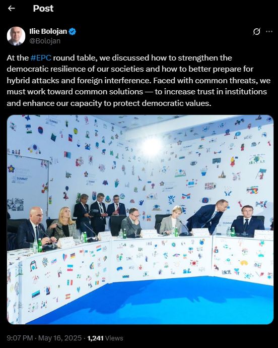La Summitul Comunității Politice Europene a fost integrată și tema „Securing Europe and strengthening democratic resilience”. De asemenea, președintele interimar a transmis un mesaj și pe rețeaua X, seara trecută.
