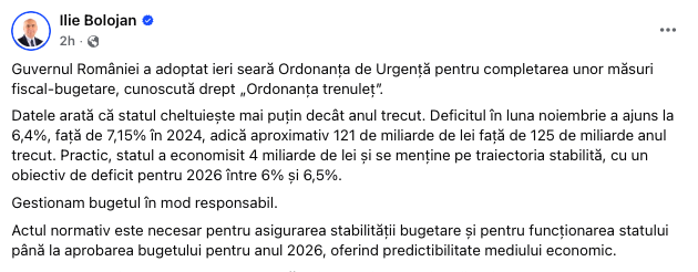 Premierul Ilie Bolojan a vorbit miercuri despre hotărârea Guvernului de a adopta cu o seară înainte „Ordonanța trenuleț”. Într-o postare pe Facebook, el a explicat că acest pachet de măsuri vine să mențină statul pe un curs stabil până când va fi aprobat bugetul pe 2026. Potrivit lui Bolojan, cifrele recente arată că statul „cheltuiește mai puțin decât anul trecut”, iar deficitul bugetar pe noiembrie s-a situat la 6,4%, față de 7,15% în aceeași perioadă a anului trecut. Premierul a subliniat că această evoluție indică că Guvernul gestionează cheltuielile în mod responsabil și se aliniază la obiectivul unui deficit de aproximativ 6–6,5% pentru 2026.