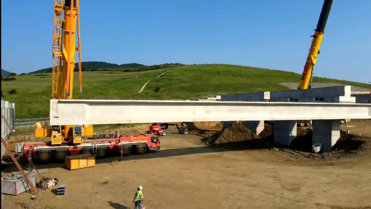 Imagini inedite de la montarea primei grinzi pe lotul 2 al AUTOSTRĂZII Sibiu-Pitești. Sorin Grindeanu: „Sunt necesare 1050 de grinzi din beton”