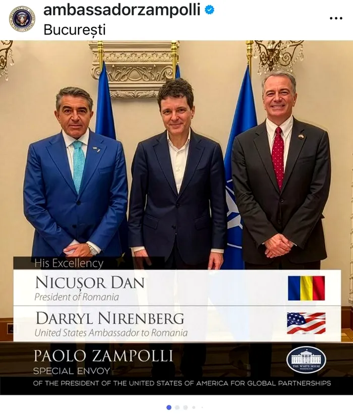 Paolo Zampolli, trimisul lui Trump, s-a întâlnit la Palatul Cotroceni cu președintele Nicușor Dan și cu noul ambasador al SUA, Darryl Nirenberg, în siajul celebrării parteneriatului NATO, la data de 5 aprilie. Întâlnirea dintre cei doi oficiali americani și președintele României a avut drept scop reafirmarea parteneriatului transatlantic, a precizat Zampolli, într-o postare pe Facebook.