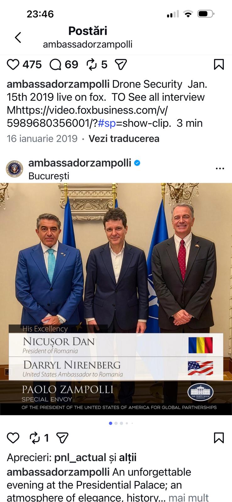 „O seară de neuitat la Palatul Prezidențial; o atmosferă de eleganță, istorie și viziune. O onoare să fim găzduiți de președintele Dan împreună cu ambasadorul nostru Darryl, în cadrul unei întâlniri ce reafirmă forța parteneriatului și a angajamentului nostru comun față de un viitor prosper”, a transmis Zampolli.