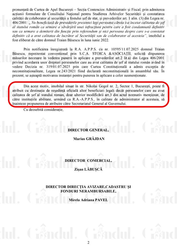„Din acest motiv, imobilul situat în str. Nikolai Gogol nr. 2, Sector 1, București, poate fi atribuit cu destinația de reședință oficială altor beneficiari legali decât persoanele care au avut calitatea de șef al statului român, doar ulterior modificării art. 3 din actul normativ menționat, de către instituțiile abilitate, urmând ca R.A.-A.P.P.S., în calitate de administrator al acestuia, să înainteze propunerea de atribuire către Secretariatul General al Guvernului”, se arată în documentul trimis de directorul Regiei, Marius Grăjdan.
